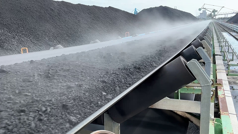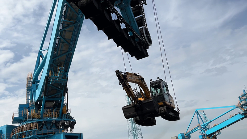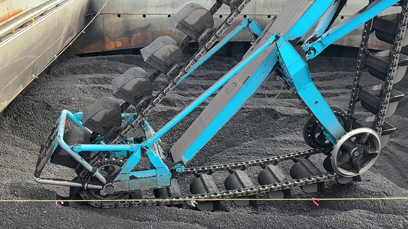 船倉の石炭はアンローダで荷揚げし、ベルトコンベヤに載せて貯炭場まで運びます。さらにスタックリクレーマによって貯炭場へ積み上げます。